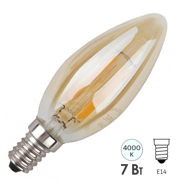 Светодиодная винтажная (ретро) лампочка формы свеча ERA с нитевидными светодиодами, золотистая колба, мощностью 7 Ватт, с цоколем E14, нейтральный белый свет Б0047033
