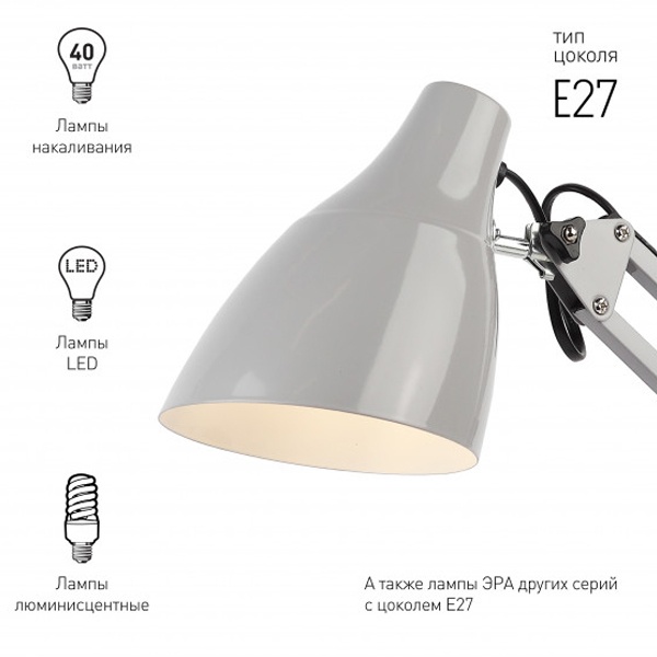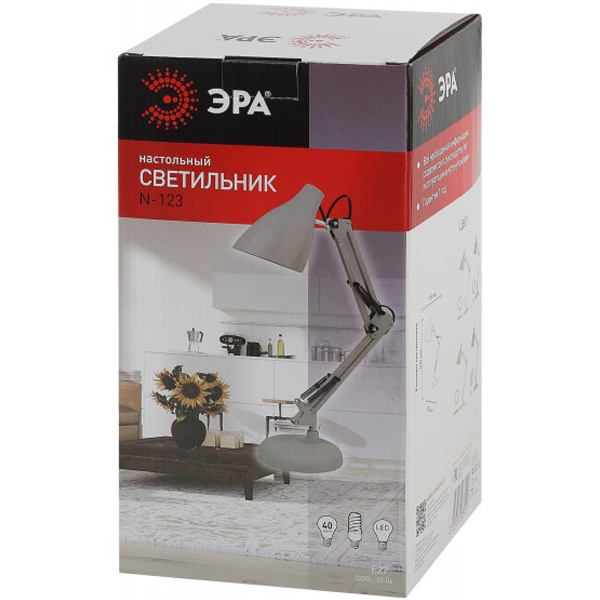 Настольный светильник ЭРА N-123 трендового дизайна с классической конструкцией может использоваться с разными источниками света - лампой накаливания, компактной люминесцентной лампой (КЛЛ) или светодиодной (LED) лампой. Выключатель на проводе. Устойчивое основание. Высота плафона регулируется двухсекционной сгибающейся стойкой, направление света - поворотом и наклоном плафона в любом направлении.Лампа в комплект не входит.