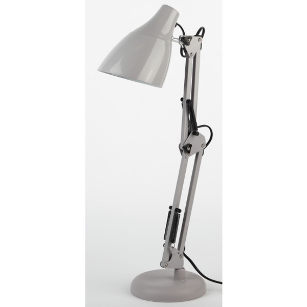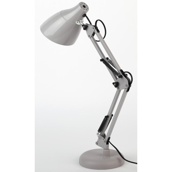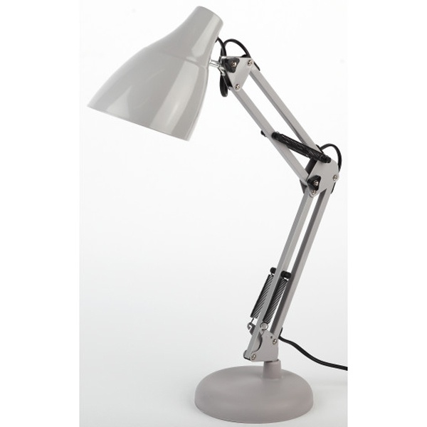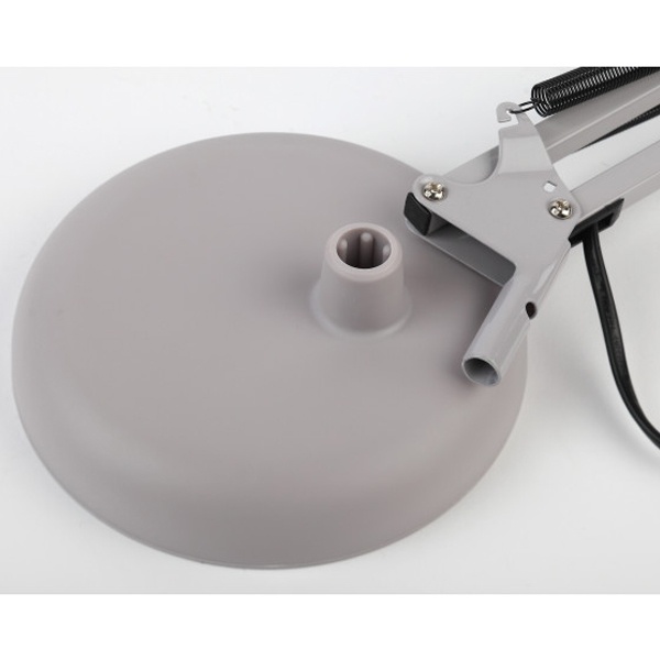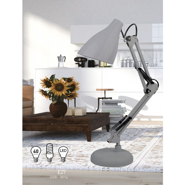 Серый классический настольный светильник ЭРА N-123 под лампу с цоколем Е27, двухсекционная сгибающая стойка на круглым основанием, питанием от сети 220 Вольт. Б0047199