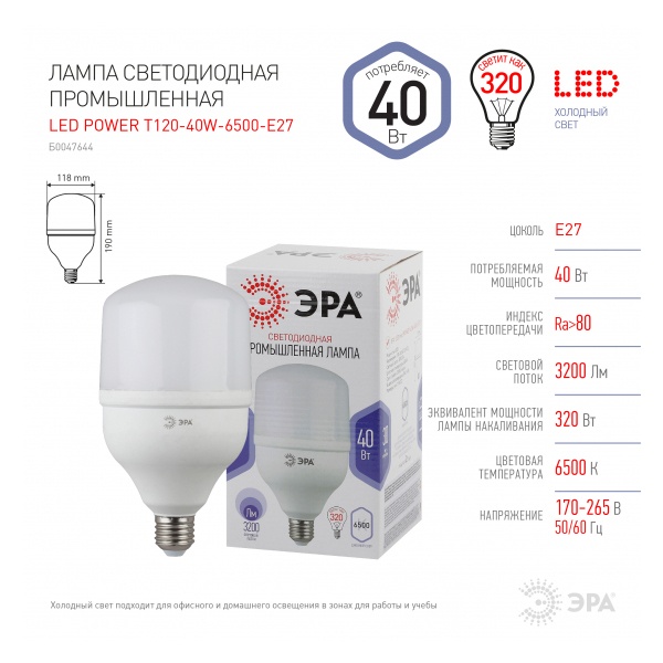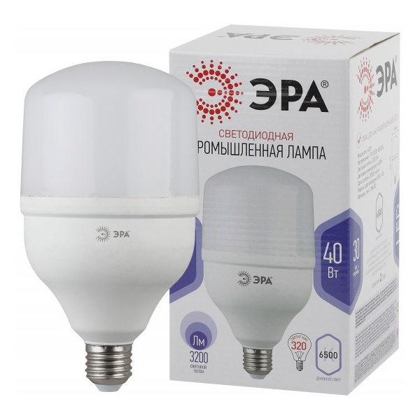 Светодиодная промышленная лампочка ERA, мощностью 40 Ватт, с цоколем E27, холодный дневной свет Б0047644