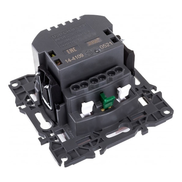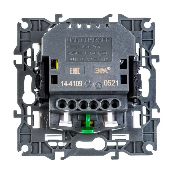Электрическая бытовая розетка с заземляющим контактом и защитой контактов шторками, выполнена из негорючего пластика без содержания галогенов с латунной контактной группой. В розетку так же встроено зарядное устройство, что позволяет экономить место, достаточно только дата кабеля для зарядки гаджета. Установка производится скрыто в подрозетники на винтах либо в распор на лапки. Самозажимные клеммы для быстрого подключения. Суппорт с пазами для выравнивания по горизонтали и вертикали при создание рабочего места из нескольких электроустановочных изделий.