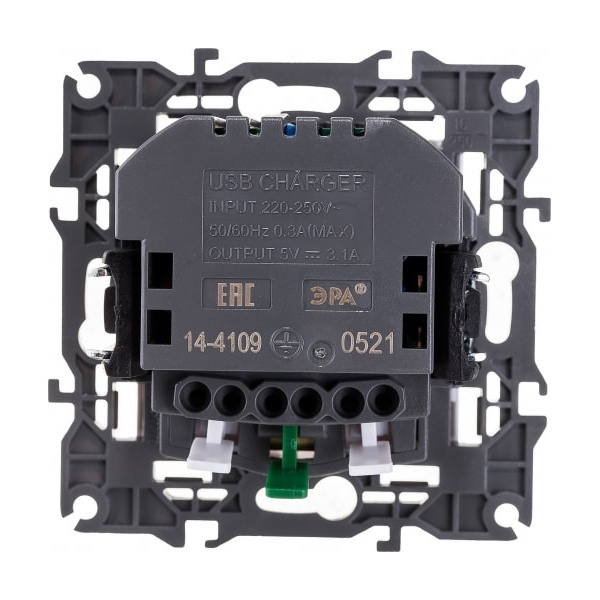 Розетка с USB серии Эра Elegance цвет белый 14-4109-01. Номинальные характеристики . Оснащёна автоматическими клеммами для надёжной фиксации жил кабеля в механизме. Рамки приобретаются отдельно. Рамки Эра Elegance ПЛАСТИК: 1 пост 14-5001-хх, 2 поста 14-5002-хх, 3 поста 14-5003-хх, 4 поста 14-5004-хх, 5 постов 14-5005-хх; СТЕКЛО: 1 пост 14-5101-хх, 2 поста 14-5102-хх, 3 поста 14-5103-хх, 4 поста 14-5104-хх; МЕТАЛЛ: 1 пост 14-5201-хх, 2 поста 14-5202-хх, 3 поста 14-5203-хх, 4 поста 14-5204-хх; ДЕРЕВО: 1 пост 14-5301-хх, 2 поста 14-5302-хх, 3 поста 14-5303-хх, 4 поста 14-5304-хх (хх - код цвета: 00-прозрачный, 01-белый, белёный дуб, 02-слоновая кость, 03-алюминий, 04-шампань, 05-чёрный, чёрное дерево, 07-ясень, 09-дуб, 10-венге, 11-клён, 14-медь, 21-жёлтый, 22-оранжевый, 23-красный, 25-бордо, 26-лайм, 27-зелёный, 28-голубой, 29-синий, 30-розовый, 31-мокко, 32-серый, 41-сталь, 42-титан).