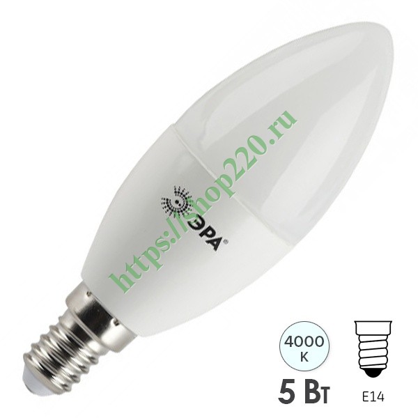 Светодиодная лампочка формы свеча ERA, мощностью 5 Ватт, с цоколем E14, нейтральный белый свет, матовая колба Б0047932
