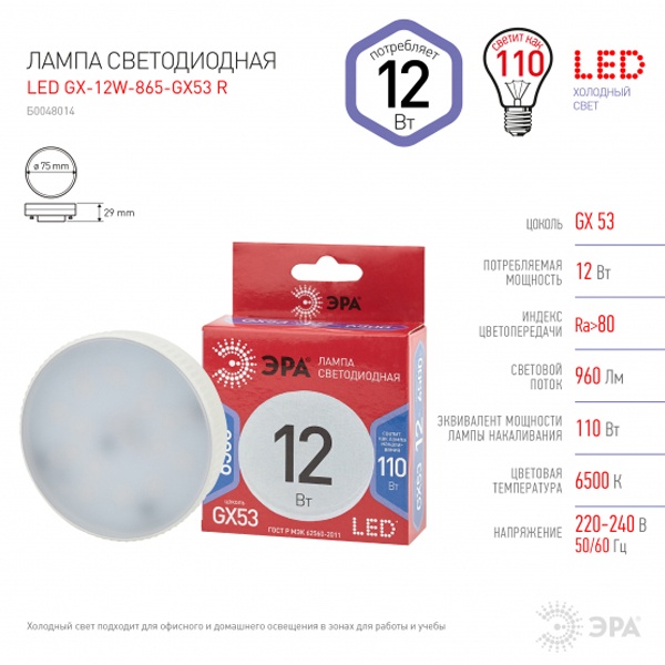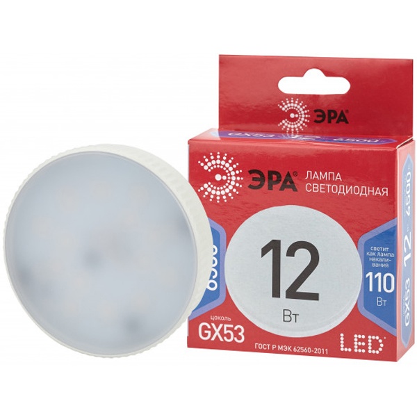 Лампочка светодиодная ЭРА RED LINE LED GX-12W-865-GX53 R GX53 12Вт таблетка холодный дневной свет