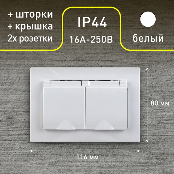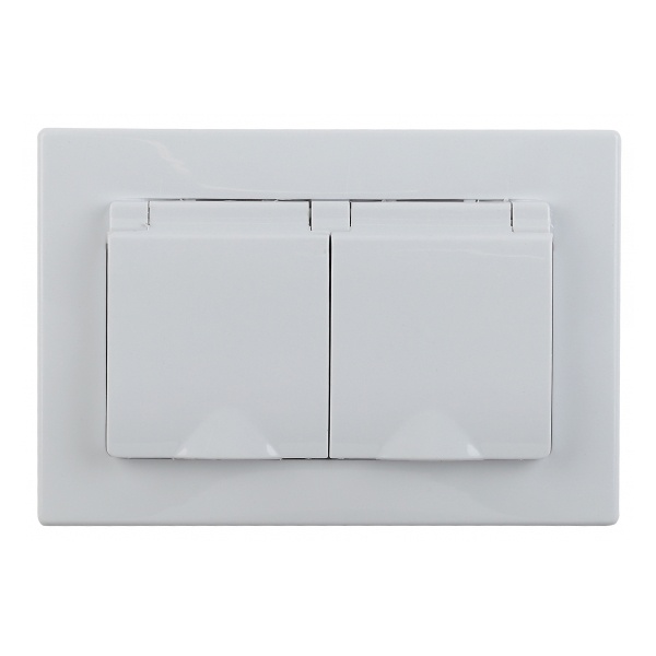 Розетка электрическая двойная с заземляющим контактом, защитой контактов шторками и крышкой для установки скрыто в одну монтажную коробку на распорные лапки, либо винты. Манжета в комплекте позволяет устанавливать розетку во влажных помещениях(ванна, туалет) Накладка и рамка выполнены из негорючего пластика. Механизм изготовлен из керамики стойкой к температурам. Латунная контактная группа с винтовым подключением.