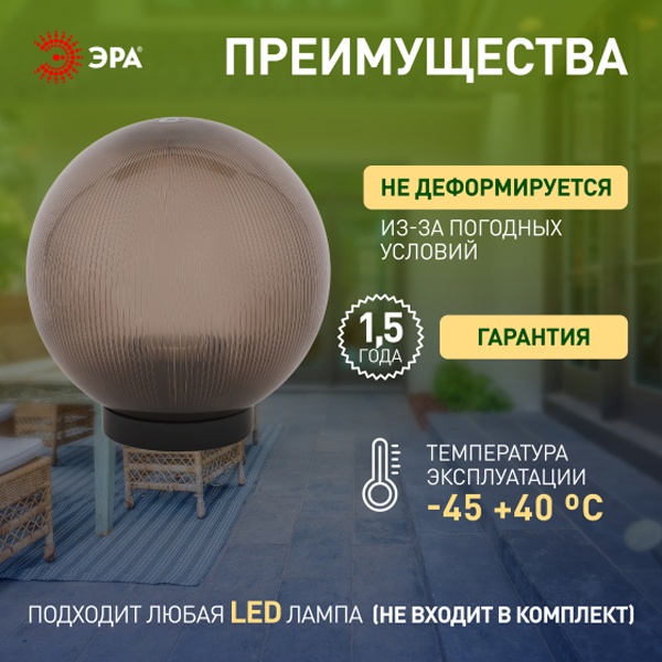 Уличный светильник на столб с рассеивателем призма в форме дымчатого шара диаметром 350 мм, с цоколем Е27 мощностью 100 Вт, ЭРА НТУ Б0048073