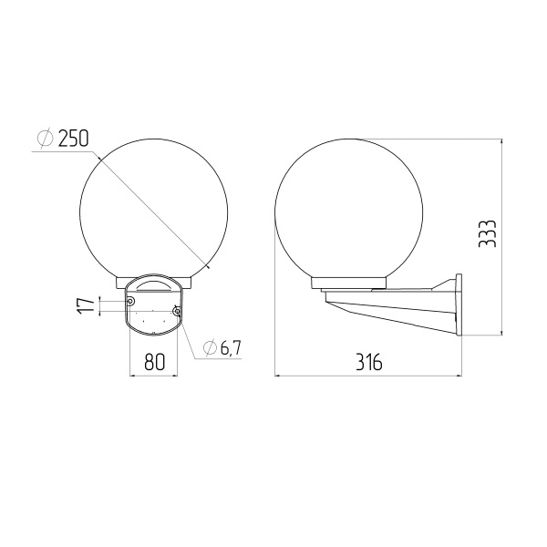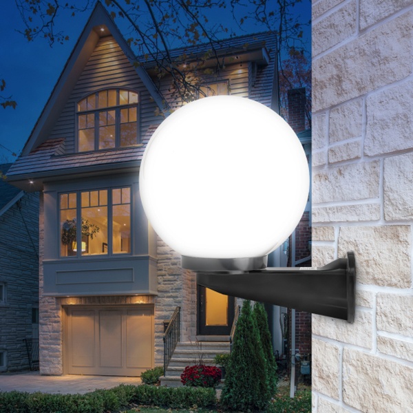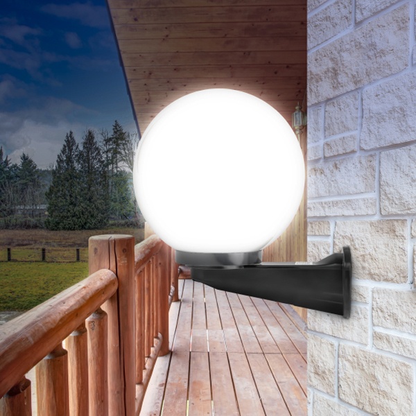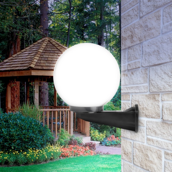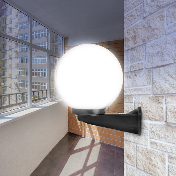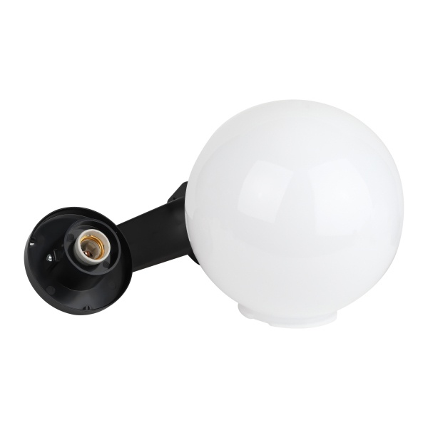 Светильник устанавливается на стену на выносном черном кронштейне. Не подвержен коррозии, деформации под воздействием погодных условий (основание выполнено из поликарбоната, рассеиватель-полиметилметакрилата). Цоколь Е27 для ламп ЛОН, КЛЛ, LED. Расчитан на мощность эквивалентную 60 Ватт лампы накаливания.