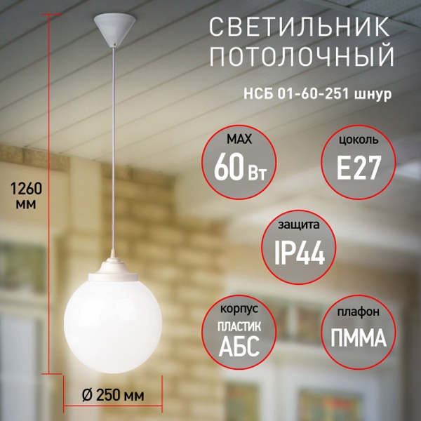 Подвесной уличный светильник на шнуре с рассеивателем опал в форме белого шара диаметром 250 мм, с цоколем Е27 мощностью 60 Вт, ЭРА НСБ Б0048086