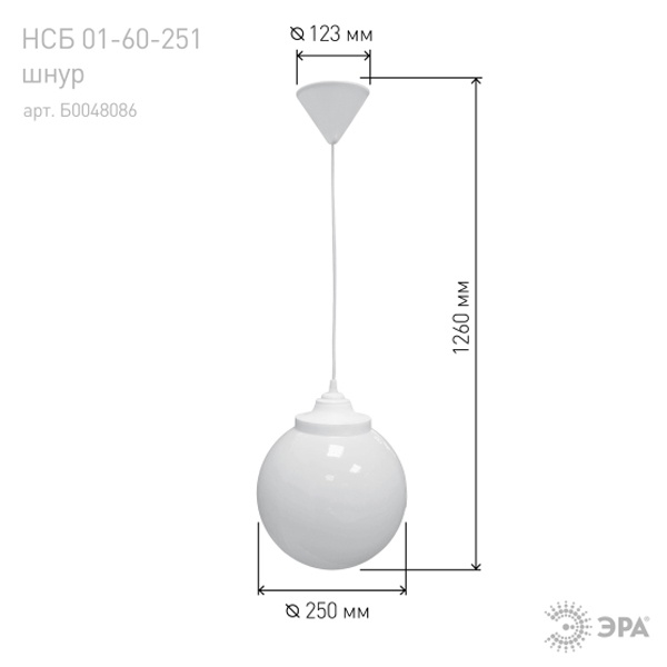 Светильник садово-парковый НСБ 02-60-251 шар опал подвес шнур D=250мм (6/48) ЭРА Б0048086