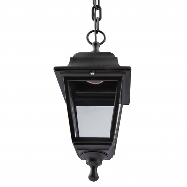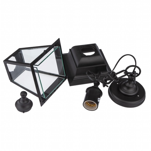 Осветительный, фасадный, четырехгранный прибор подвесного монтажа под лампу с цоколем E27 максимальной мощностью 60 Ватт, высота с подвесом 700 мм, прозрачный рассеиватель, черного цвета Б0048105