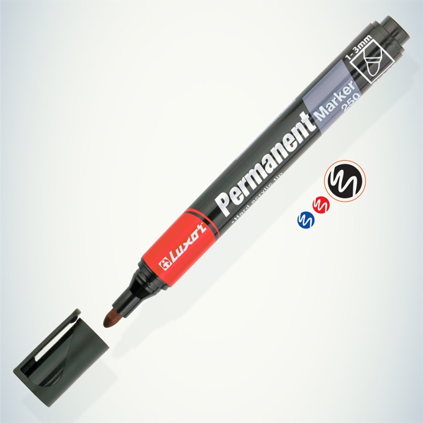 Перманентный маркер черного цвета. Оснащен пулевидным наконечником, который обеспечивает ровные и четкие линии. Подходит для письма на различных поверхностях, таких как бумага, картон, пластик, металл, стекло и другие материалы. Чернила устойчивы к стиранию, воздействию воды и выцветанию. Идеально подходит для повседневного использования, маркировки и долговременной надписи.