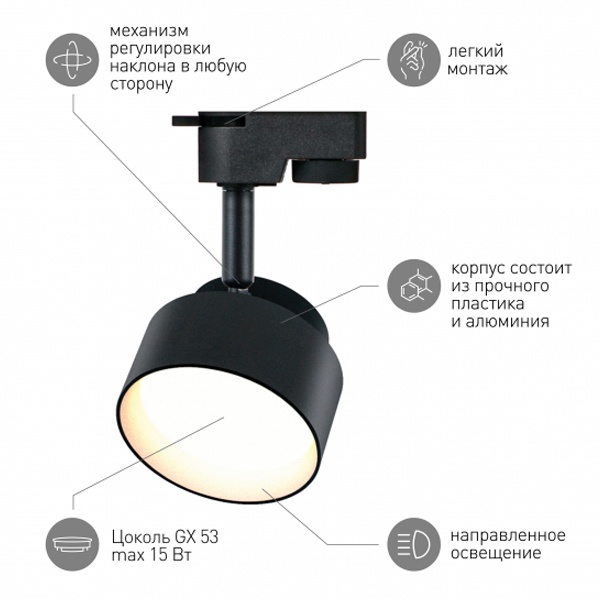 • Светильник трековый однофазный ЭРА TR16-GX53 BK под лампу-GX53, алюминий, цвет черный