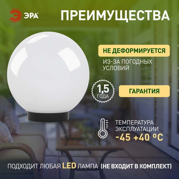 Не подвержен коррозии, деформации под воздействием погодных условий (основание выполнено из поликарбоната, рассеиватель-полиметилметакрилата). Цоколь Е27 для ламп ЛОН, КЛЛ, LED. Расчитан на мощность эквивалентную 100 Ватт лампы накаливания.