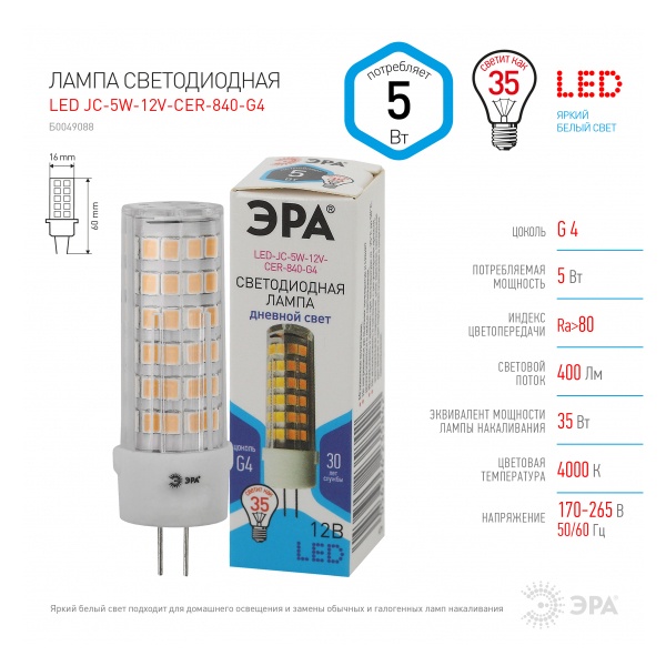 Капсульная, низковольтная, светодиодная лампочка ERA, мощностью 5 Ватт, с цоколем G4, нейтральный белый свет Б0049088