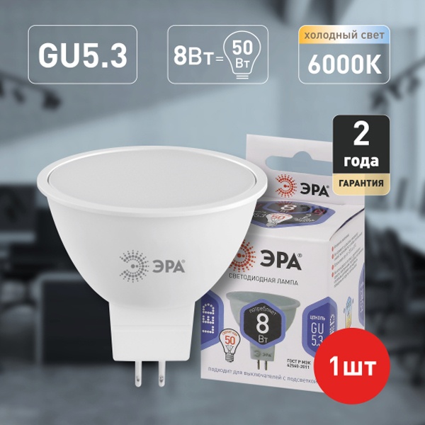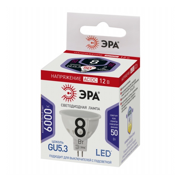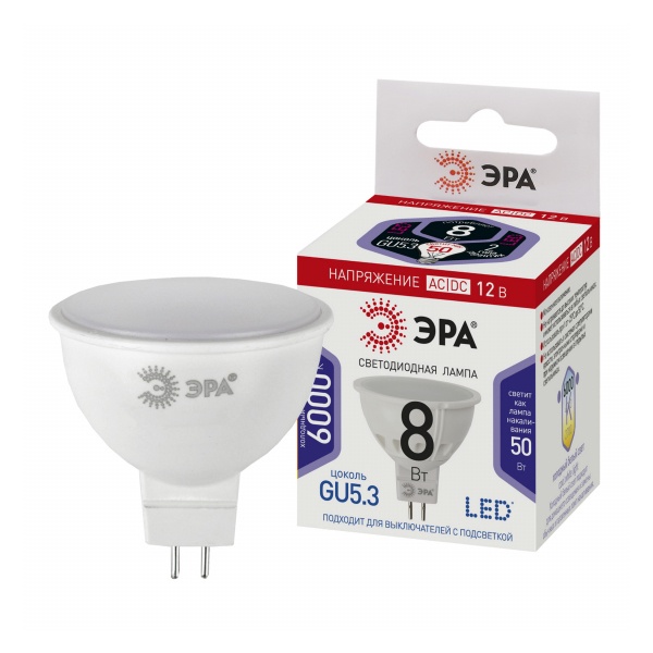 Лампа светодиодная ЭРА LED MR16 8W 860 6000K 12V GU5.3 дневной свет Б0049095