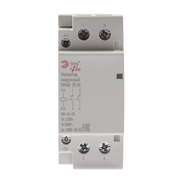 Коммутационный прибор серии КМ40-20 отечественной компании Эра предназначен для дистанционного управления различными электрическими устройствами. Модульный контактор состоит из системы контактов, дугогасительной и электромагнитной систем. Его управление осуществляется с помощью вспомогательной цепи электрического тока проходящего через катушку. В нормальном состоянии контакты прибора всегда разомкнуты, что обеспечивает электробезопасность и удобство использования. Данное устройство имеет ширину в 2 модуля и оснащено 2 нормально открытыми контактами. Устройство рассчитано на нагрузку номинального тока 40 Ампер при рабочем напряжении цепи управления 230 Вольт и частоте 50 Герц. Максимально допустимое напряжение изоляции не должно превышать 500 Вольт. Контактор широко используется в электроустановках жилых комплексов и производственных цехов и служит для автоматизации и управления различными технологическими процессами, в том числе в системах освещения, кондиционирования и вентиляции. Монтаж прибора осуществляется на DIN-рейку шириной 35 мм. Материалом изготовления корпуса является устойчивый к горению пластик – полиамид.