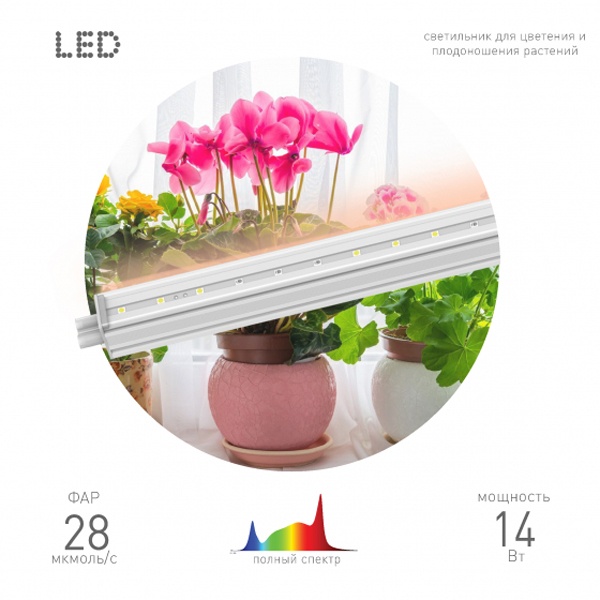 Светодиодный светильник ЭРА FITO-14W-Т5-Ra90 мощностью 14 Вт – отличный вариант для растений на всем протяжении их развития. Правильное сочетание длинн волн и энергии в спектре данной лампы - отличный рецепт для подкормки свтом Ваших растений. Светильник не слепит ярко фиолетовыми оттенками, его свечение приятно для глаз. В то же время спектр оптимален для роста и развития растений вне зависимости от сорта и культуры. Растения выращенные под данным светильником имеют выраженный, специфичный для них аромат и вкус. Находясь под данной фитолампой, Ваши зеленые друзья научатся с легкостью переживать пересадку и пикировку. Площадь эффективного излучения составляет 1,4 м2.