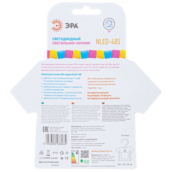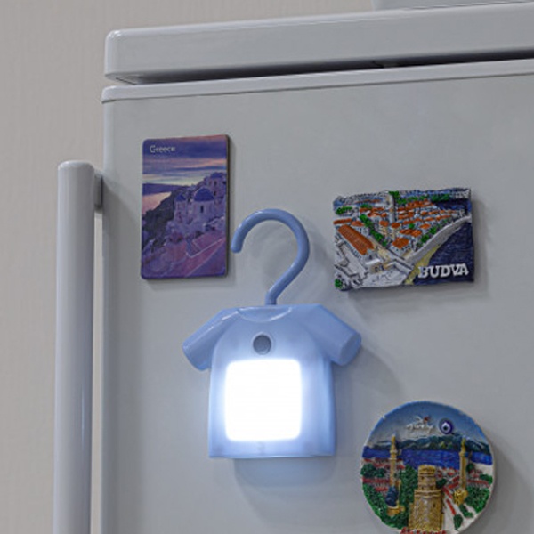 Удобный, красивый и функциональный светильник-ночник со светодиодами (LED) с выключателем. Дизайн корпуса ночника напоминает рубашку на вешалке. Светильник автономный, работает от элементов питания 3 х ААА (не входят в комплект поставки), есть крючок для подвеса с поворотом в любом направлении. Есть магнитное крепление - на металлических поверхностях держится без крюка. Также светильник-ночник можно просто поставить, он будет устойчиво стоять. Используйте его где удобно - можно повесить в шкаф для подсветки, в любое другое подходящее место, просто поставить и даже прикрепить на холодильник. Поменять батарейки очень легко. Поставляется в блистерной упаковке с евроотверстием.