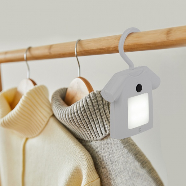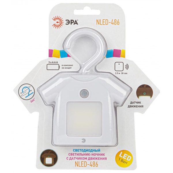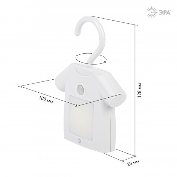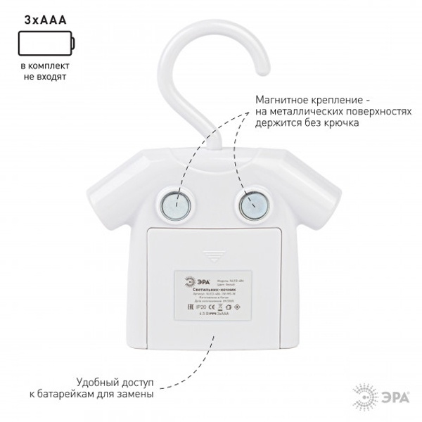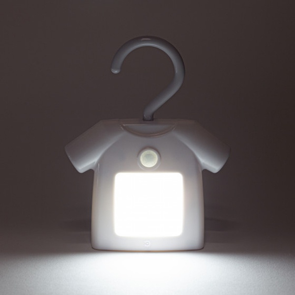 Удобный, красивый и функциональный светильник-ночник со светодиодами (LED) с выключателем. Дизайн корпуса ночника напоминает рубашку на вешалке. Светильник автономный, работает от элементов питания 3 х ААА (не входят в комплект поставки), есть крючок для подвеса с поворотом в любом направлении. Есть магнитное крепление - на металлических поверхностях держится без крюка. Также светильник-ночник можно просто поставить, он будет устойчиво стоять. Используйте его где удобно - можно повесить в шкаф для подсветки, в любое другое подходящее место, просто поставить и даже прикрепить на холодильник. Поменять батарейки очень легко. Поставляется в блистерной упаковке с евроотверстием.