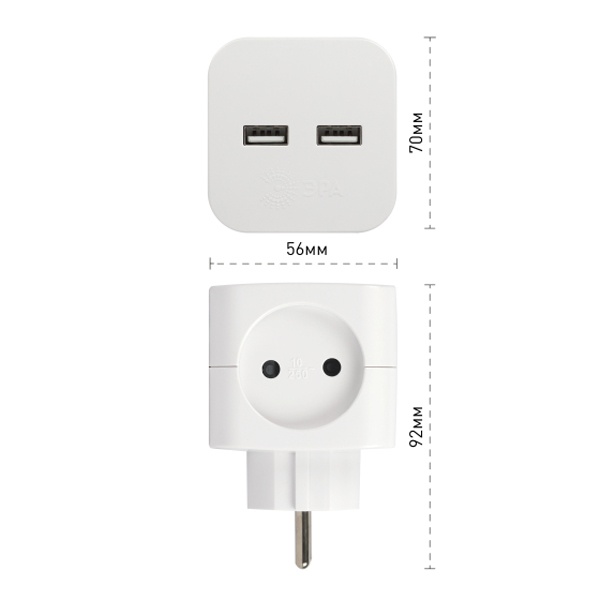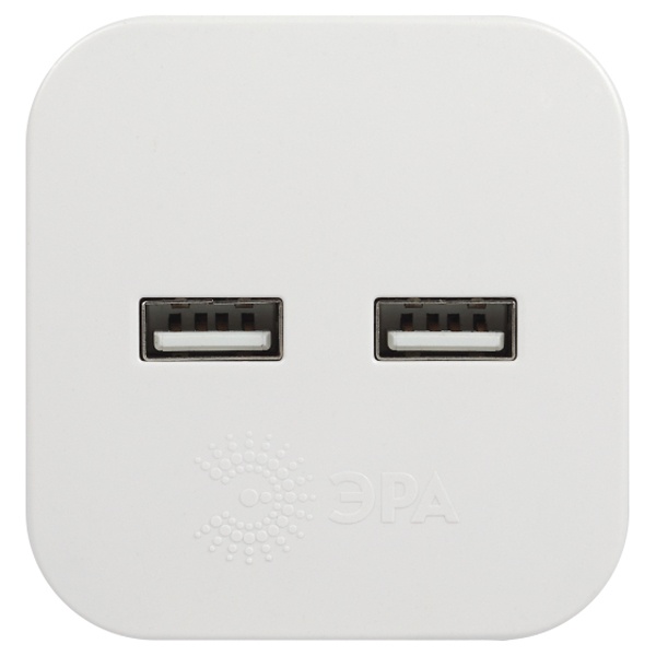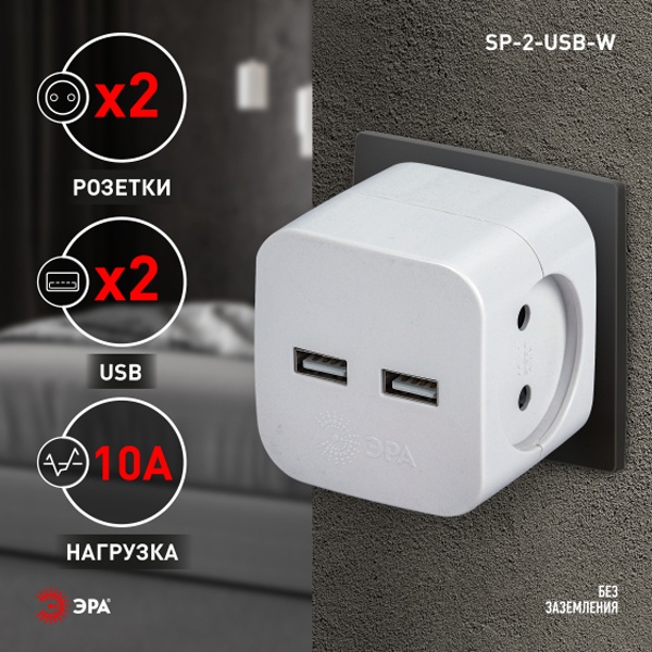 Разветвитель электрический SP-2-USB-W на 2 розетки 220В+ 2xUSB 2400мА без заземл 10А бел. Эра Б0049531
