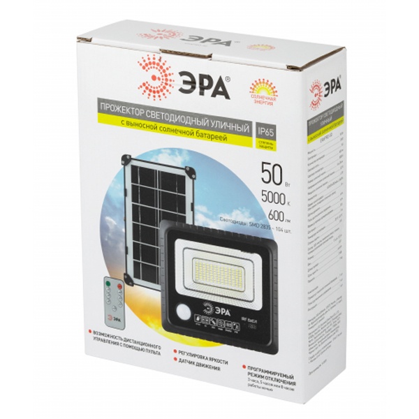 ЭРА Прожектор светодиодный уличный на солн. бат. 50W, 360 lm, 5000K, с датч. движения, ПДУ, IP65 (10