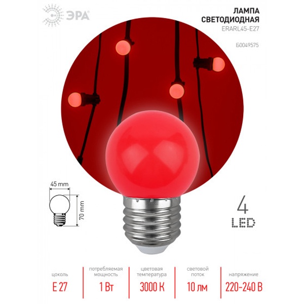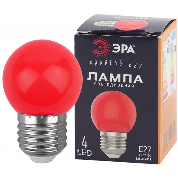 Лампа светодиодная ERARL45-E27 P45 1Вт шар красн. E27 4SMD для белт-лайт ЭРА Б0049575