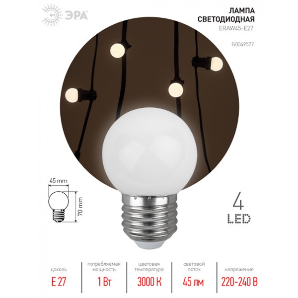 Декоративная светодиодная лампа ЭРА "Белт-лайт" с цоколем Е27 и прозрачной колбой шар (Р45). Мощность - 1 Вт. Светит тёплым белым светом. Идеально подходит для использования в уличной гирлянде-конструкторе ЭРА "Белт-лайт", дающей возможность самостоятельного дизайна и монтажа праздничной иллюминации. В составе гирлянды-конструктора позволяет создавать уникальное праздничное освещение по индивидуальным параметрам и для конкретных задач. Вы сами выбираете длину подсветки, цвет ламп и расстояние между источниками света! Это идеальное решение для декора фасадов зданий, оформления витрин, общественных пространств на свежем воздухе