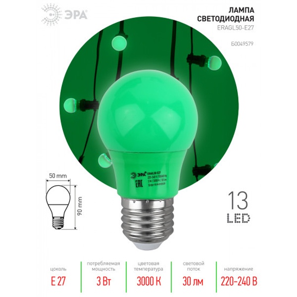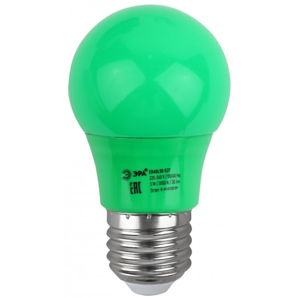 Лампа светодиодная ERAGL50-E27 A50 3Вт груша зел. E27 13SMD для белт-лайт ЭРА Б0049579