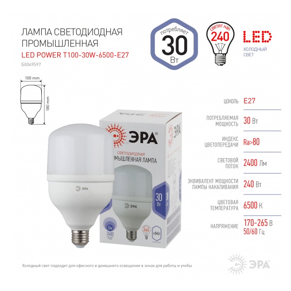 Светодиодная лампа промышленного освещения мощностью 30 Ватт, с цоколем E27, холодный дневной свет Б0049597