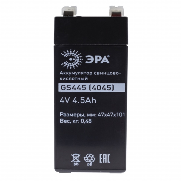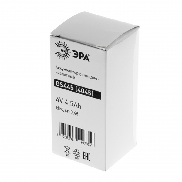 Б0050077 Аккумуляторная батарея ЭРА GS445 4V 4,5 А/ч 47х47х101мм (Свинцово-кислотный) 5056396247357