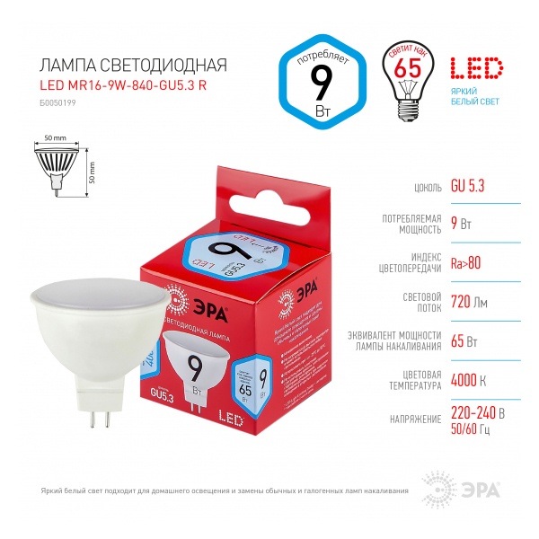 Б0050199 Лампа светодиодная ЭРА LED RED LINE MR16-9W-840-GU5.3 4000K 220V холодный свет