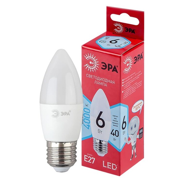 Энергосберегающая LED лампочка свеча мощностью 6 Ватт с цоколем E27 нейтральный белый свет Б0050232