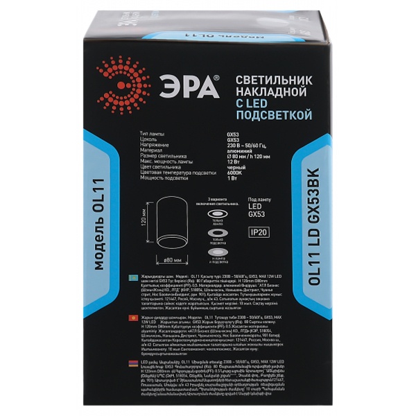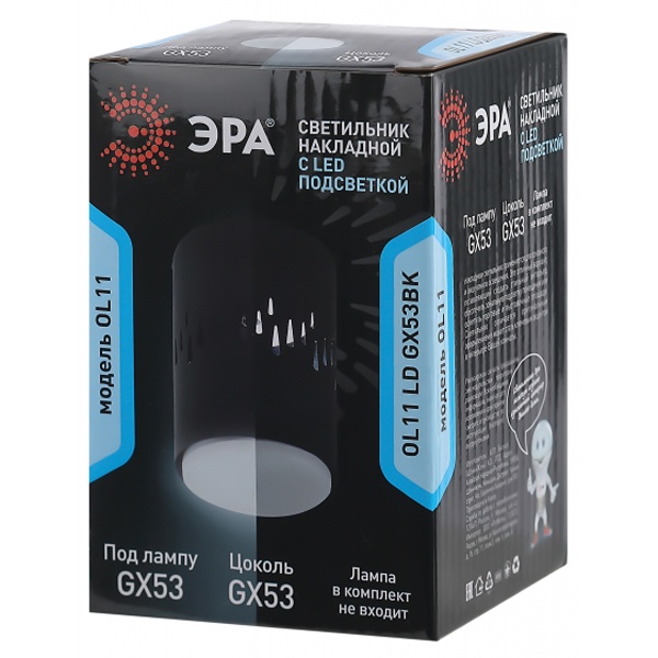 Светильник направленного света с подсветкой, накладного монтажа ЭРА под лампу с цоколем GX53 максимальной мощностью 15 Ватт, цвет черный Б0050270