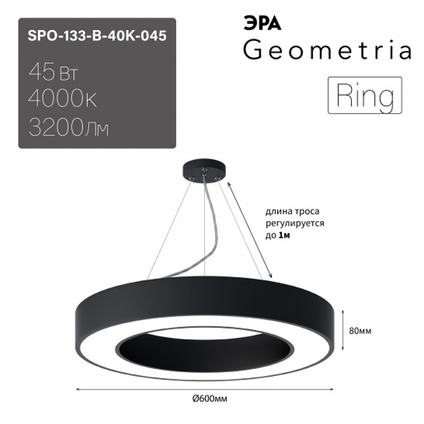 Осветительный LED прибор подвесного монтажа ERA Геометрия Ринг, круглой формы, мощностью 45 Ватт, нейтральный белый свет, черного цвета Б0050563