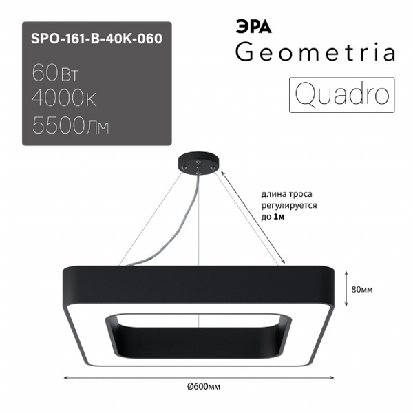 Осветительный LED прибор подвесного монтажа ERA Геометрия Квадро, квадратной формы, мощностью 60 Ватт, нейтральный белый свет, черного цвета Б0050583