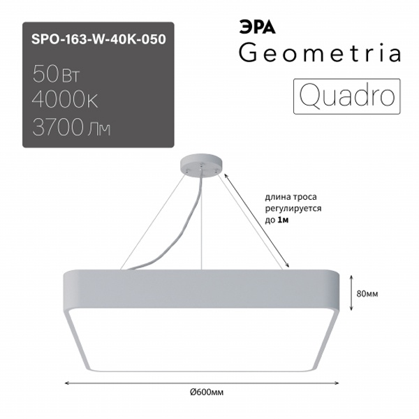 Осветительный LED прибор подвесного монтажа ERA Геометрия Квадро, квадратной формы, мощностью 50 Ватт, нейтральный белый свет, белого цвета Б0050586