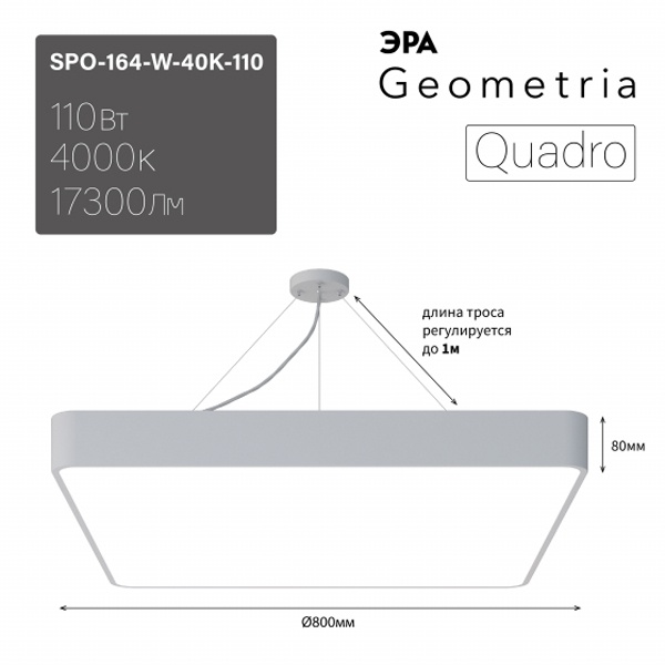 Осветительный LED прибор подвесного монтажа ERA Геометрия Квадро, квадратной формы, мощностью 110 Ватт, нейтральный белый свет, белого цвета Б0050588
