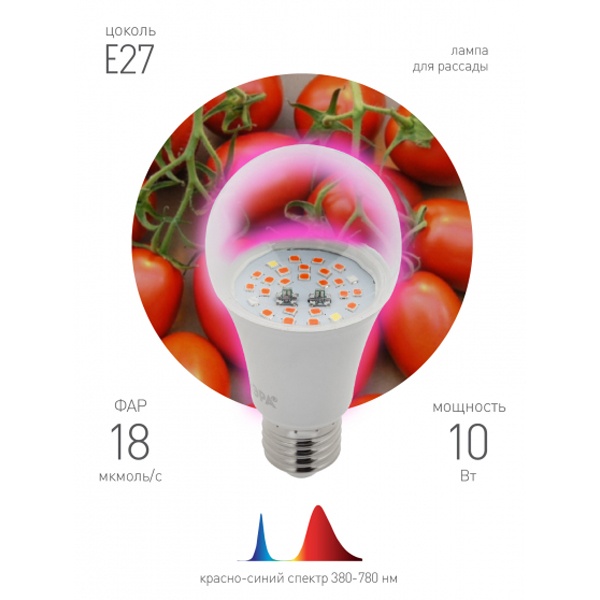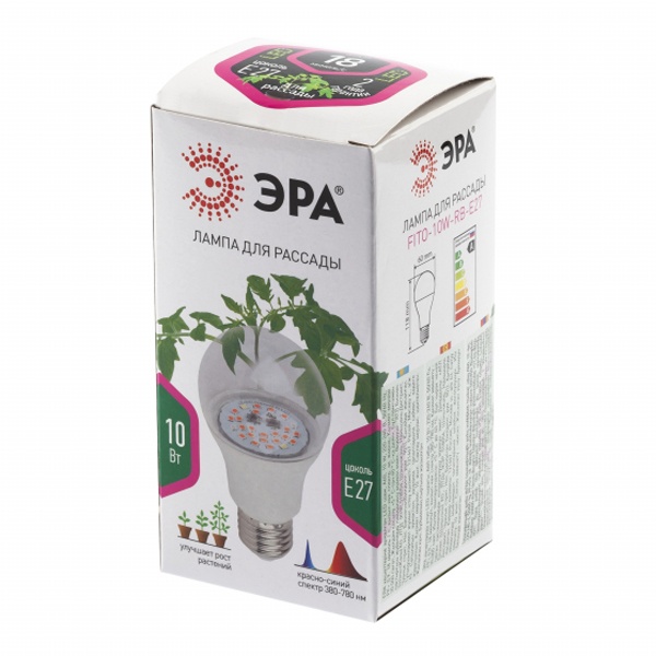 Лампа ЭРА FITO-10W-RB-E27 красно - синего спектра для выращивания рассады, досветки комнатных цветов станет Вашим не заменимым помощником. Данная лампа отлично подходит для зелени, пасленовых. Рекомендуемая высота расположения лампы над листьями от 5 до 25 см. Соотношение синего к красному как 1 к 3 дает возможность растениям марш бросок на набор питательных веществ и рост листьев. Так как масса выращиваемых растений прямо пропорциональна затраченной мощности, необходимо понимать что усиление эффекта от лампы возможно при увеличении светового потока. Во избежание ожога листьев мощность не должна превышать 450 Вт на м2. при высоте подвеса 4 метра. Прозрачный поликарбонатный рассеиватель сохраняет выходящую энергию, в отличие от ламп с молочным рассеивателем. Новый рестайлинг лампы ЭРА FITO-10W-RB-E27-K лампа ЭРА FITO-10W-RB-E27 отличился более хорошей светоотдачей, связанной более хорошей подобранной биновкой светодиодов, более низким током через кристалл, что позволило снизить температуру на светодиоде на 5 градусов и соответственно увеличить их срок жизни. Разгруженным драйвером, что позволило уменьшить температуру на управляющей микросхеме на 10 градусов, что так же увеличит ресурс ее работы. Спектрограмма и суммарная мощность лампы не изменилась.