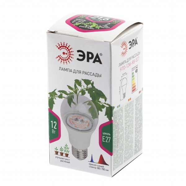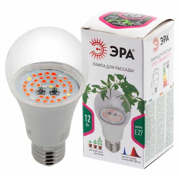 Лампа ЭРА FITO-10W-RB-E27 красно - синего спектра для выращивания рассады, досветки комнатных цветов станет Вашим не заменимым помощником. Данная лампа отлично подходит для зелени, пасленовых. Рекомендуемая высота расположения лампы над листьями от 5 до 25 см. Соотношение синего к красному как 1 к 3 дает возможность растениям марш бросок на набор питательных веществ и рост листьев. Так как масса выращиваемых растений прямо пропорциональна затраченной мощности, необходимо понимать что усиление эффекта от лампы возможно при увеличении светового потока. Во избежание ожога листьев мощность не должна превышать 450 Вт на м2. при высоте подвеса 4 метра. Прозрачный поликарбонатный рассеиватель сохраняет выходящую энергию, в отличие от ламп с молочным рассеивателем. Новый рестайлинг лампы ЭРА FITO-10W-RB-E27-K лампа ЭРА FITO-10W-RB-E27 отличился более хорошей светоотдачей, связанной более хорошей подобранной биновкой светодиодов, более низким током через кристалл, что позволило снизить температуру на светодиоде на 5 градусов и соответственно увеличить их срок жизни. Разгруженным драйвером, что позволило уменьшить температуру на управляющей микросхеме на 10 градусов, что так же увеличит ресурс ее работы. Спектрограмма и суммарная мощность лампы не изменилась.