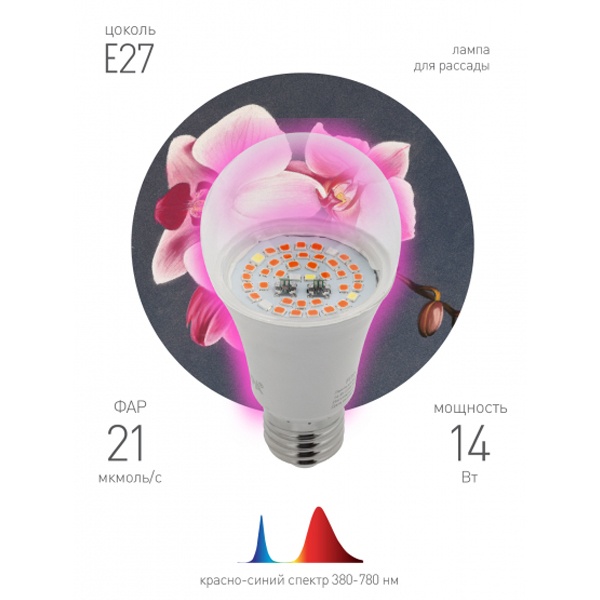 Светодиодная Фито лампа грушевидной формы ЭРА для ускорения роста растений, мощностью 14 Ватт, с цоколем E27 Б0050602