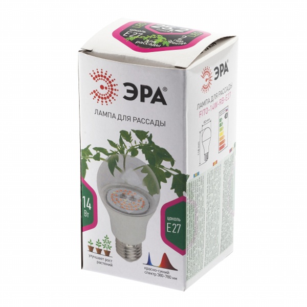 Лампа ЭРА FITO-10W-RB-E27 красно - синего спектра для выращивания рассады, досветки комнатных цветов станет Вашим не заменимым помощником. Данная лампа отлично подходит для зелени, пасленовых. Рекомендуемая высота расположения лампы над листьями от 5 до 25 см. Соотношение синего к красному как 1 к 3 дает возможность растениям марш бросок на набор питательных веществ и рост листьев. Так как масса выращиваемых растений прямо пропорциональна затраченной мощности, необходимо понимать что усиление эффекта от лампы возможно при увеличении светового потока. Во избежание ожога листьев мощность не должна превышать 450 Вт на м2. при высоте подвеса 4 метра. Прозрачный поликарбонатный рассеиватель сохраняет выходящую энергию, в отличие от ламп с молочным рассеивателем. Новый рестайлинг лампы ЭРА FITO-10W-RB-E27-K лампа ЭРА FITO-10W-RB-E27 отличился более хорошей светоотдачей, связанной более хорошей подобранной биновкой светодиодов, более низким током через кристалл, что позволило снизить температуру на светодиоде на 5 градусов и соответственно увеличить их срок жизни. Разгруженным драйвером, что позволило уменьшить температуру на управляющей микросхеме на 10 градусов, что так же увеличит ресурс ее работы. Спектрограмма и суммарная мощность лампы не изменилась.