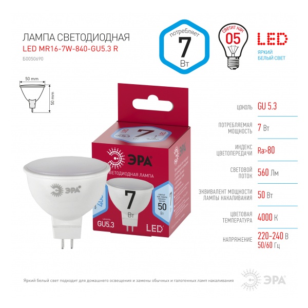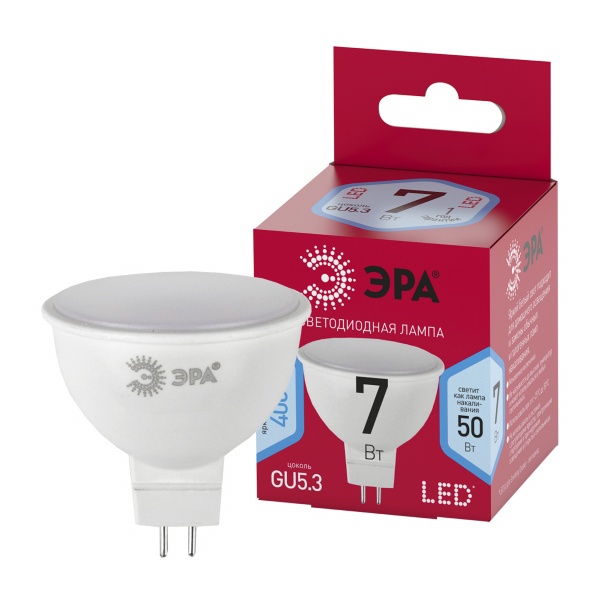 • Лампа светодиодная ЭРА LED RED LINE MR16-7W-840-GU5.3 4000K 220V холодный свет