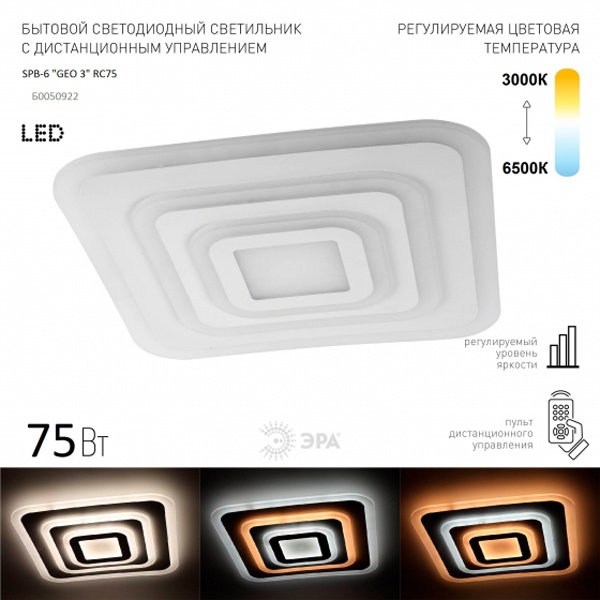 Диммируемый LED светильник потолочного исполнения Эра GEO-3 с пультом дистанционного управления, мощностью 75 Ватт Б0050922