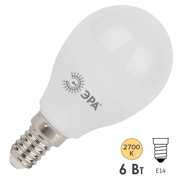Светодиодная лампочка шарик ERA мощностью 6 Ватт, с цоколем E14 (миньон), теплый свет Б0051058