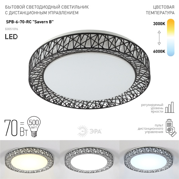 Потолочный LED светильник Эра серия Savern B диммируемый с изменением цветовой температуры 3000К-6000К, мощностью 70 Ватт, с пультом дистанционного управления Б0051096