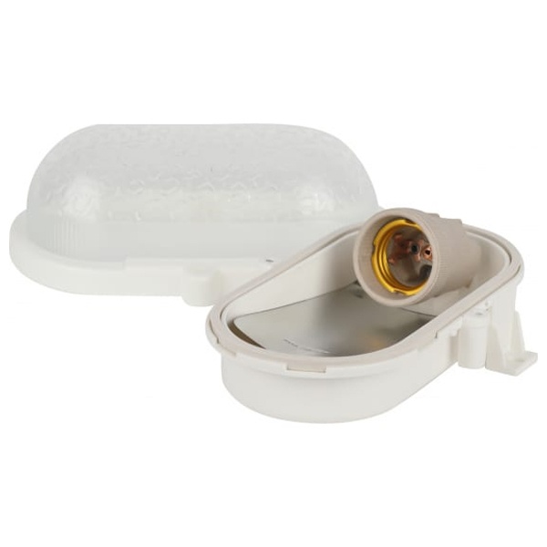 Белый овальный светильник ЭРА накладной под лампу с цоколем Е27, пылевлагозащищённый корпус пластик, рассеиватель стекло Б0052016