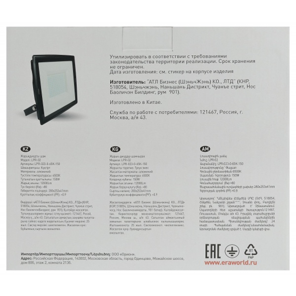 • Прожектор светодиодный ЭРА LPR-023-0-65K-150 150W 6500K 12000Lm IP65
