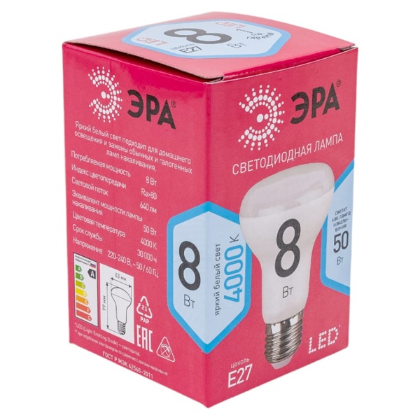 Лампа светодиодная ЭРА RED LINE LED R63 8W 840 4000K 230V E27 — рефлекторная LED-лампа с нейтральным белым светом 4000K для направленного освещения. Форм-фактор R63 подходит для светильников, где важен акцентный свет и более собранный пучок, чем у стандартных «груш». Отличный вариант для повседневной подсветки рабочих зон, витрин, ниш, коридоров и локального освещения в жилых и коммерческих помещениях.