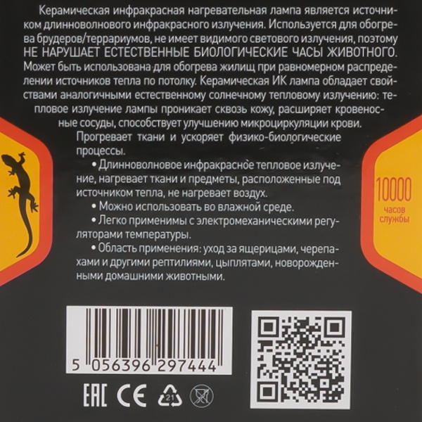 Керамическая инфракрасная нагревательная лампа является источником длинноволнового инфракрасного излучения. Используется для обогрева брудеров/террариумов, не имеет видимого светового излучения, поэтому не нарушает естественные биологические часы животного.