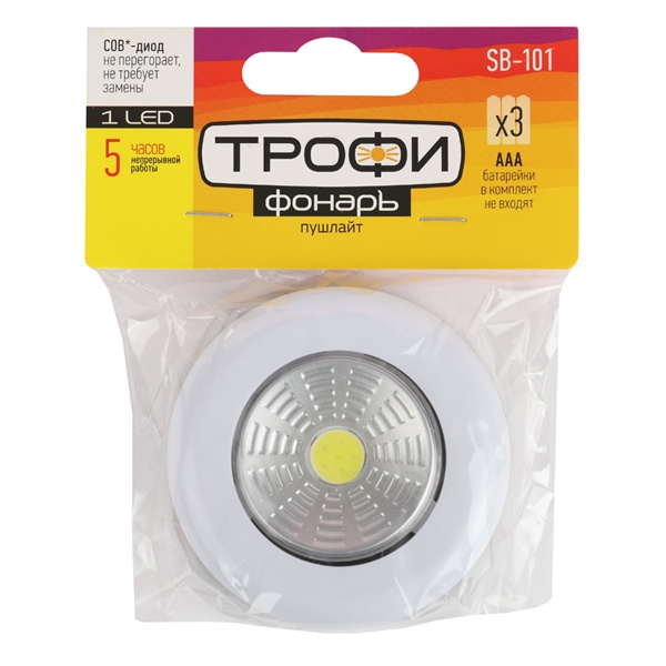Компактный фонарь-пушлайт Трофи SB-101 – отличный вариант бытовой подсветки. Монтируется на поверхность за считанные секунды – удалить защитный слой с обратной стороны корпуса и приклеить. Помогает быстро и без проблем организовать дополнительную подсветку в затемненных местах дома или дачи – в шкафу, подсобных помещениях, на стеллажах, полках, в ванной комнате, кладовой, коридоре, над рабочими столешницами кухни.
